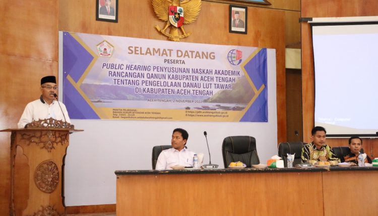Takengon – Dalam rangka proses tahapan Penyusunan Naskah Akademik Rancangan Qanun tentang Pengelolaan Danau Lut Tawar, Tim Penyusun melakukan Public Hearing dan dibuka secara resmi oleh Staf Ahli Bidang Keistimewaan Aceh, Kemasyarakatan dan Sumber Daya Manusia Setdakab Aceh Tengah Ir. Khaidir, MM mewakili Bupati Aceh Tengah Drs. Shabela Abubakar, Rabu (2/11).