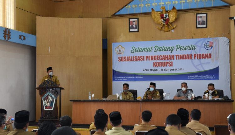 Takengon – Bupati Aceh Tengah melalui Staf Ahli Bidang Pembangunan, Ekonomi dan Keuangan M. Thamrin Elashri MA, membuka acara Sosialisasi Pencegahan Tindak Pidana Korupsi bagi aparatur pemerintahan di Kabupaten Aceh Tengah, Selasa (28/09).
