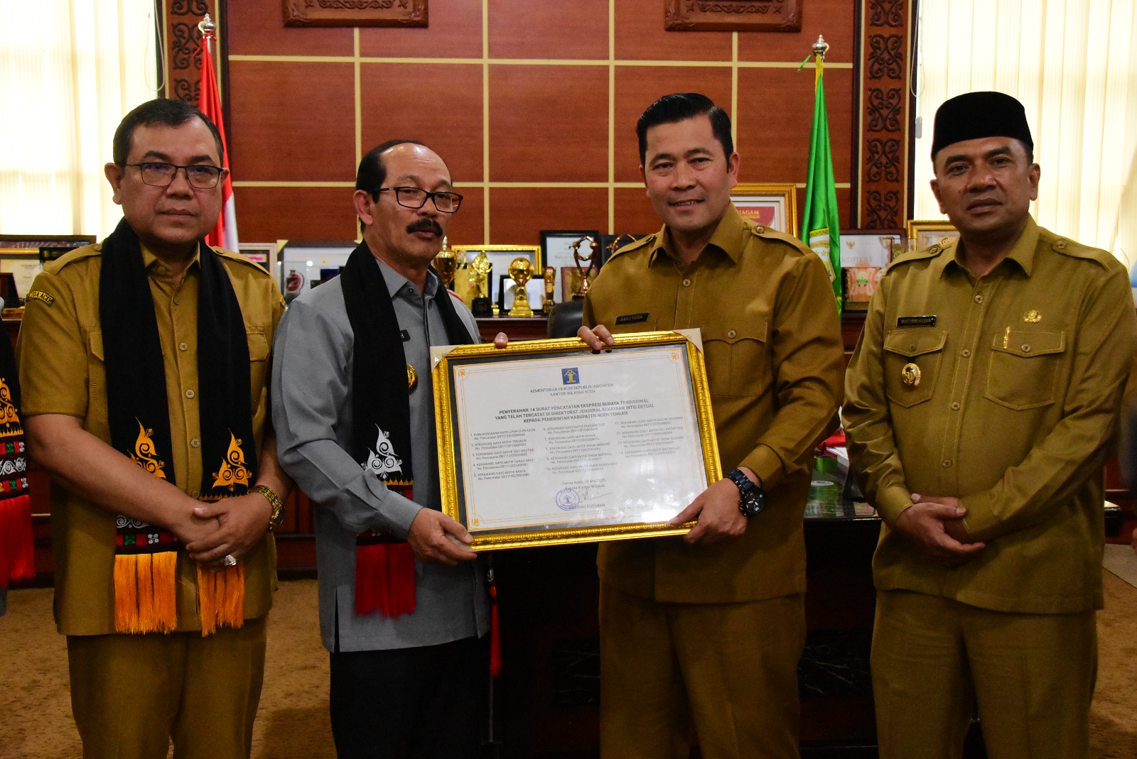 Takengon – Sebagai bentuk Sinergitas, serta masih dalam rangkaian kunjungan Kantor Wilayah Kementerian Hukum Aceh (Kemenkum Aceh) di Kabupaten Aceh Tengah, Kementerian Hukum Republik Indonesia melalui Kantor Wilayah Aceh, Serahkan surat pencatatan 14 ekpresi Budaya Tradisional yang telah dicatat di Derektorat Jendra Kekayaan Intelektual, yang terdiri dari 1 Kain Kerawang Gayo motif upuh ulen-ulen dan 13 Motif Kerawang Gayo lainya, serta 3 Sertifikat perlindungan hak atas merek dagang kepada Pemerintah Kabupaten Aceh Tengah.