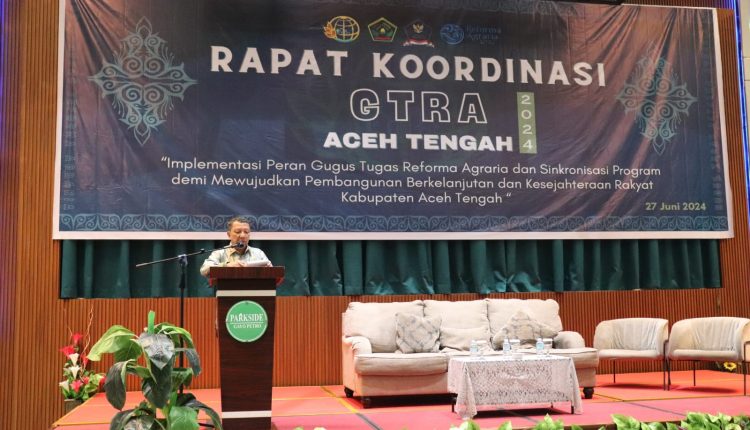 Takengon – Penjabat Bupati Aceh Tengah Ir. T. Mirzuan, MT, menghadiri Rapat Koordinasi Gugus Tugas Reforma Agraria (GRTA) Aceh Tengah Tahun 2024, bertempat di Parkside Petro Gayo Takengon, Kamis (27/04/2024).